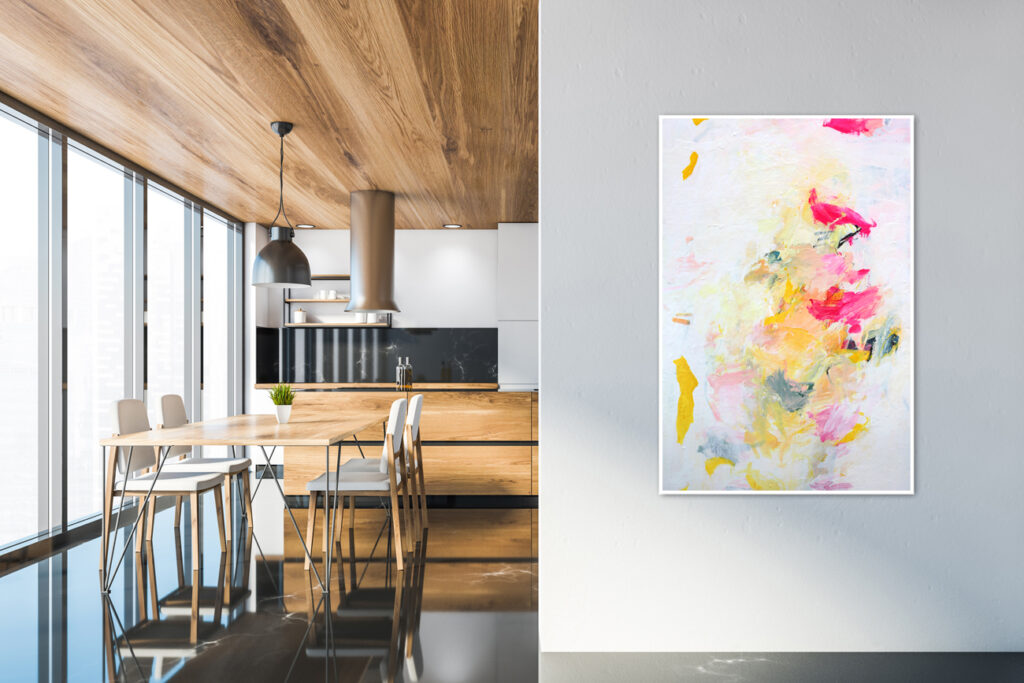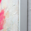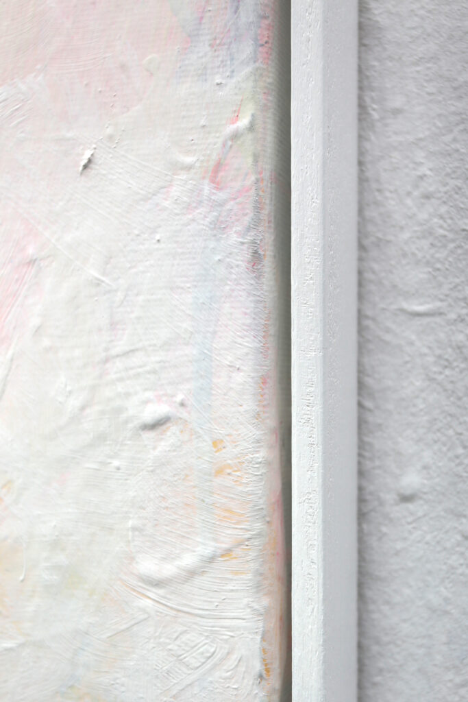 Gerahmt ist das abstrakte Gemälde in einem weiß angemalten Schattenfugenrahmen aus Holz, den ein Schreiner extra für dieses Bild angefertigt hat. Das Bild kann an zwei Schrauben / Dübeln direkt an der Wand aufgehängt werden.