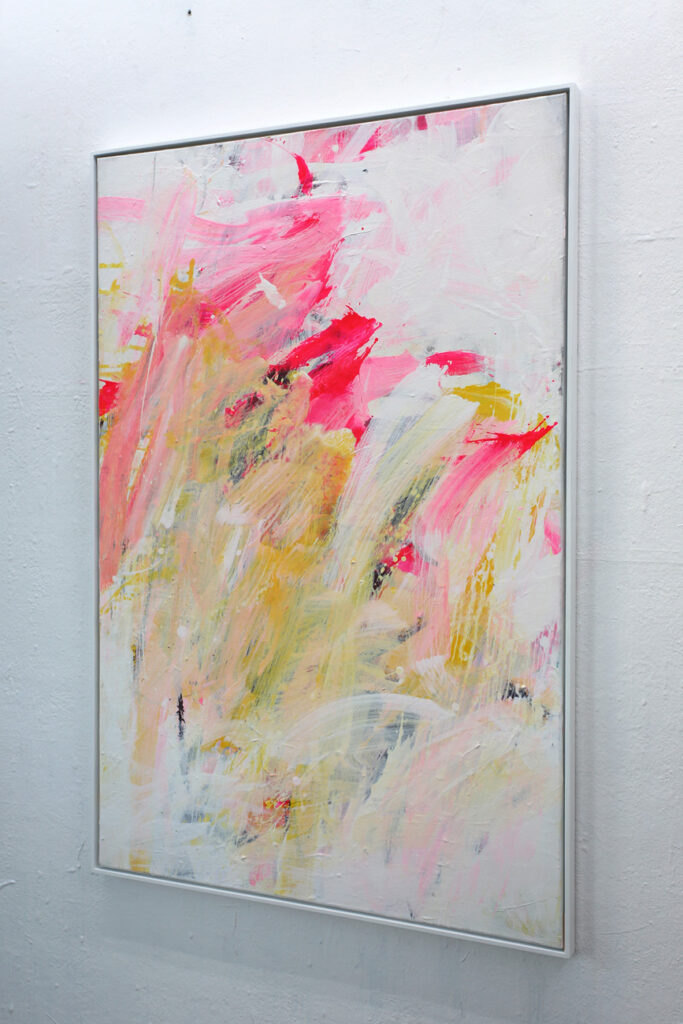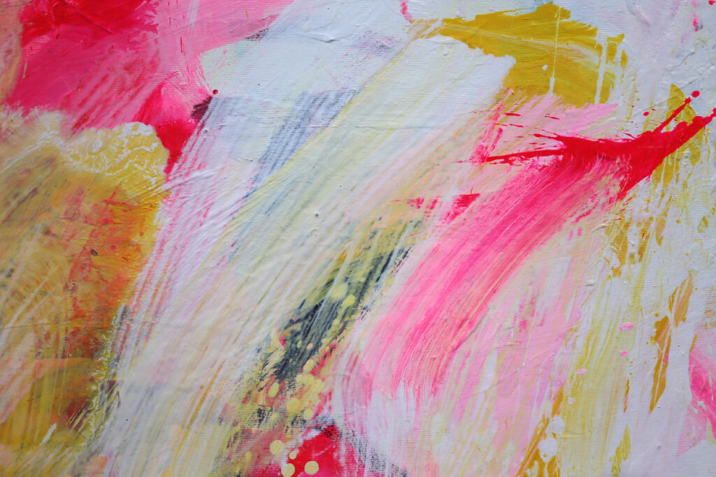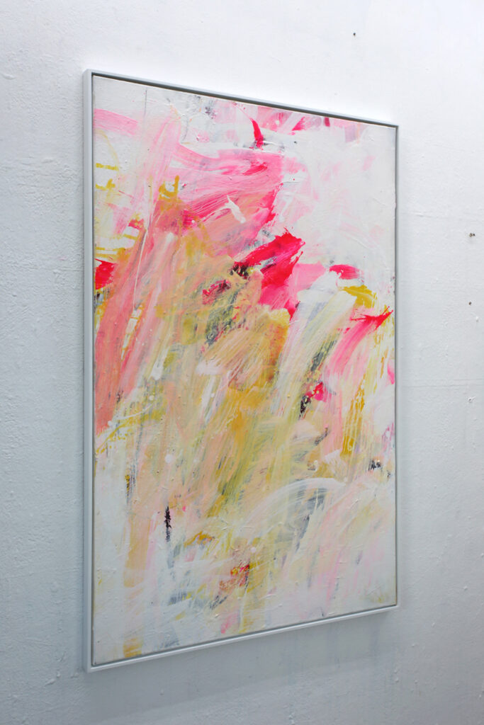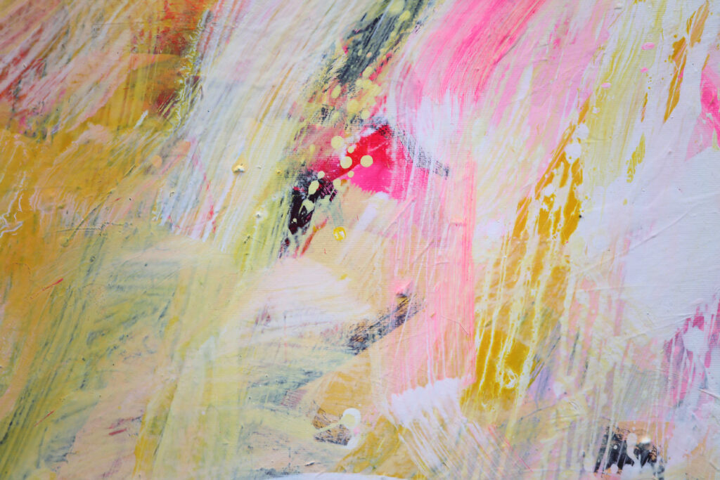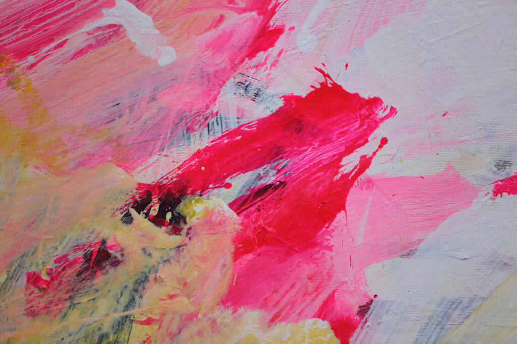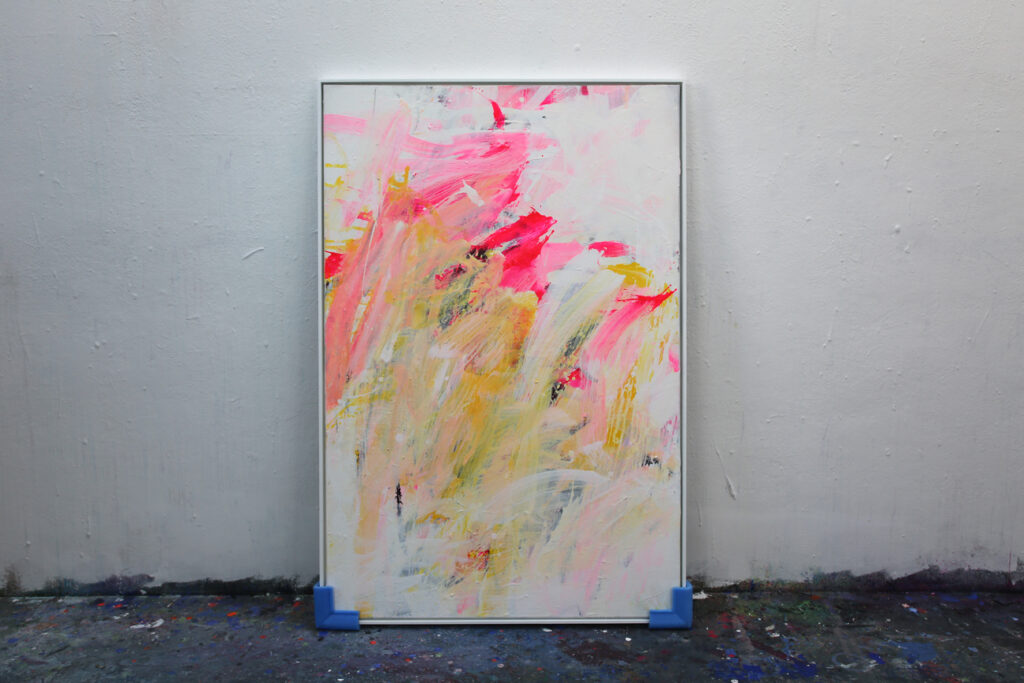 Das abstrakte Gemälde „Ab jetzt gibt’s nur noch positive Nachrichten! – Nr. 1″ ist das erste Bild einer Serie von Acrylbildern, in denen Neonpink und Gelb dominieren. Immer kombiniert mit viel Weiß. Dadurch entsteht eine extrem freundliche, freudige, gute Laune machende und alles Schlechte vertreibende Bildwirkung – ohne dass die Bilder dabei in den Kitsch abdriften.