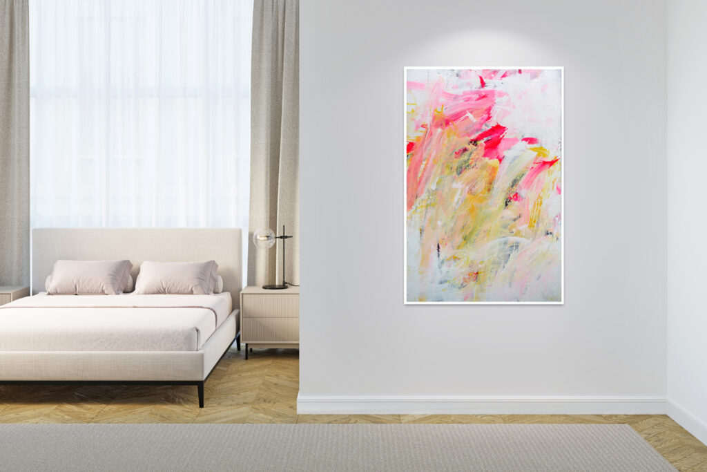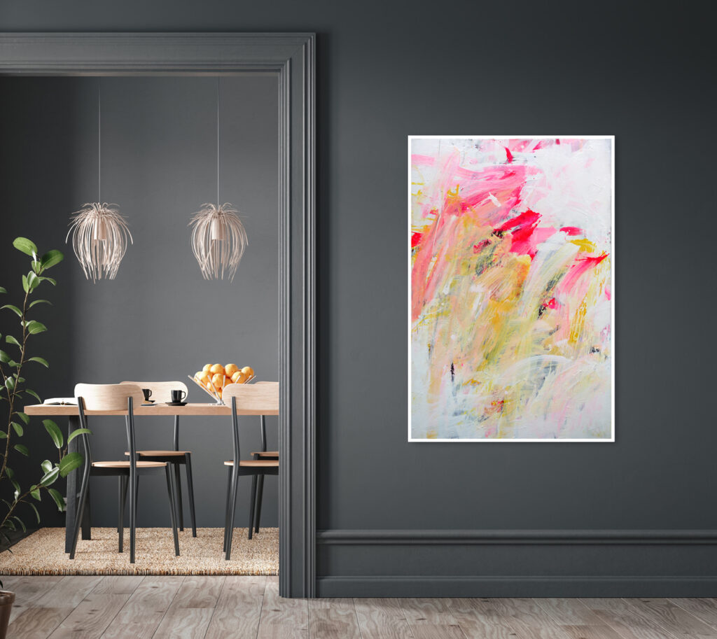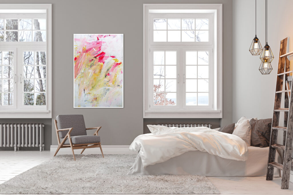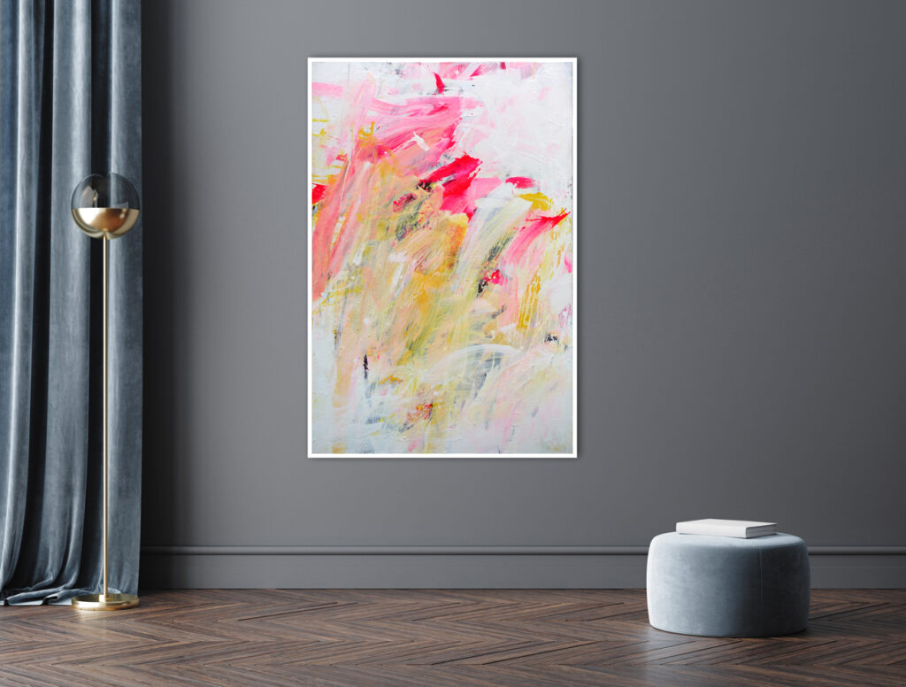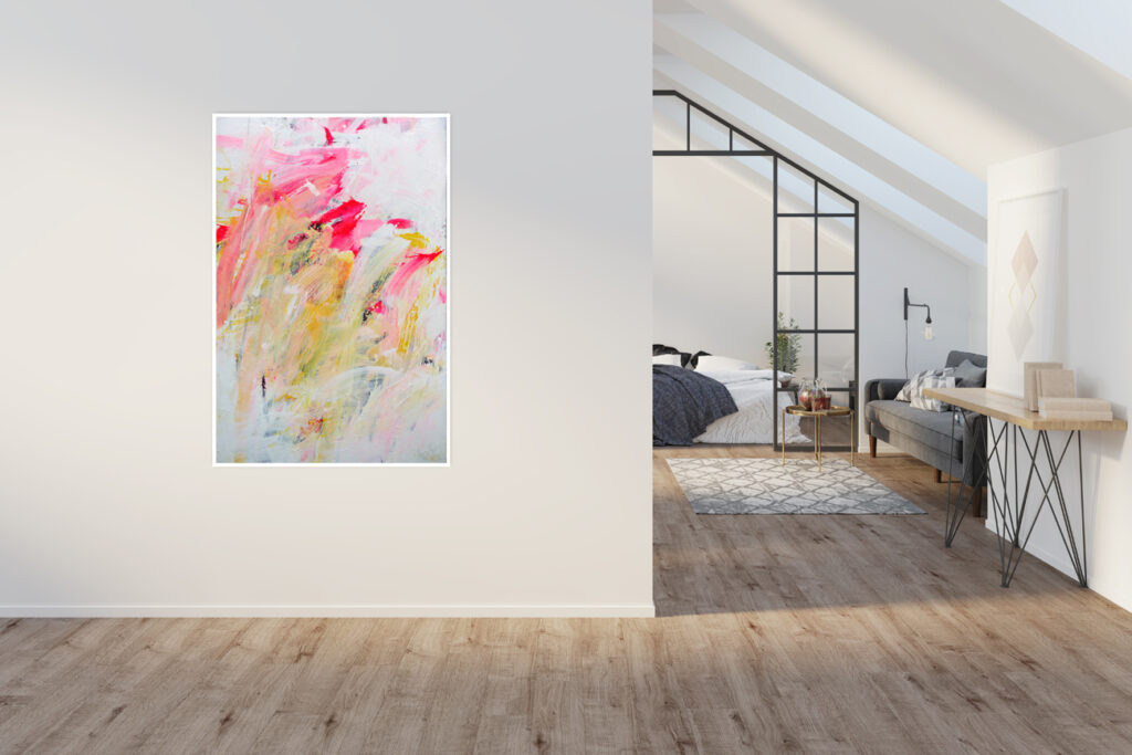 Das abstrakte Gemälde „Ab jetzt gibt’s nur noch positive Nachrichten! – Nr. 1″ ist das erste Bild einer Serie von Acrylbildern, in denen Neonpink und Gelb dominieren. Immer kombiniert mit viel Weiß. Dadurch entsteht eine extrem freundliche, freudige, gute Laune machende und alles Schlechte vertreibende Bildwirkung – ohne dass die Bilder dabei in den Kitsch abdriften.