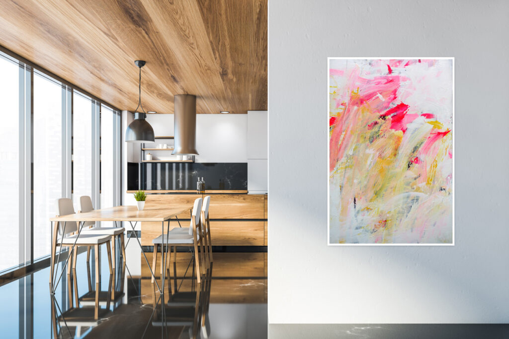 Gerahmt ist das abstrakte Gemälde in einem weiß angemalten Schattenfugenrahmen aus Holz, den ein Schreiner extra für dieses Bild angefertigt hat. Das Bild kann an zwei Schrauben / Dübeln direkt an der Wand aufgehängt werden.