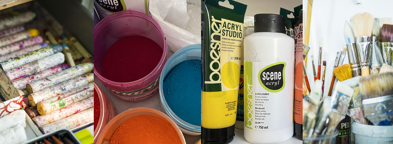 Zur Verfügung gestellt werden Farben der Eigenmarke Boesner, sowie der Marken Goya, sowie einige Pigmente, Wachskreiden, Kohle und Pastellkreiden. Sollten Sie lieber mit höher pigmentierter Farbe arbeiten oder höherpreisigen Marken, dürfen Sie diese gerne mitbringen. Farben, Pinselnutzung und Pigmente sind im Preis inkludiert. Bitte keine Ölfarbe verwenden.