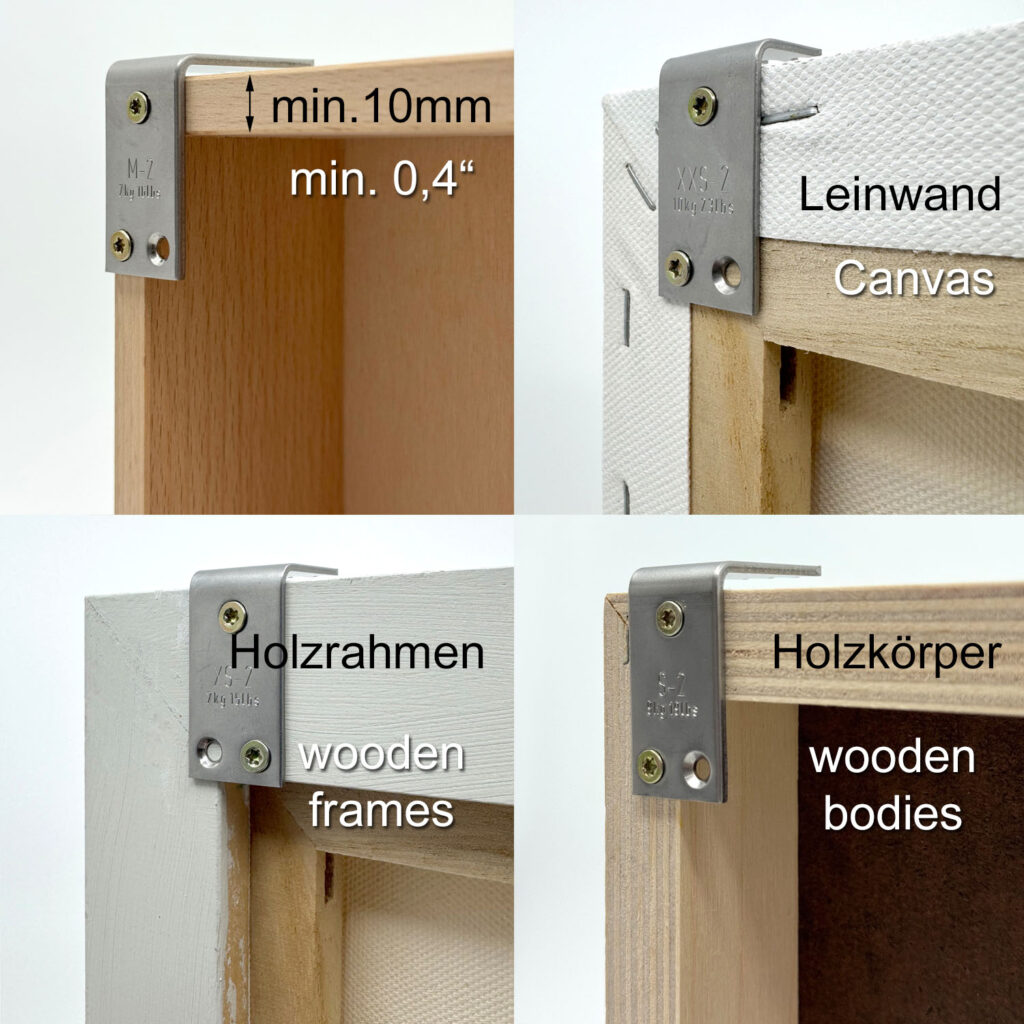 Egal ob das Bild in einer Ausstellung, in der Galerie, beim Arzt oder an der Wand zu Hause hängt: Die geniale Seilumlenkung führt das Seil an den Bildschwerpunkt heran und richtet dadurch das Kunstwerk parallel zur Wand aus. Das sonst typische Neigen des Bildes nach vorne wird verhindert.
