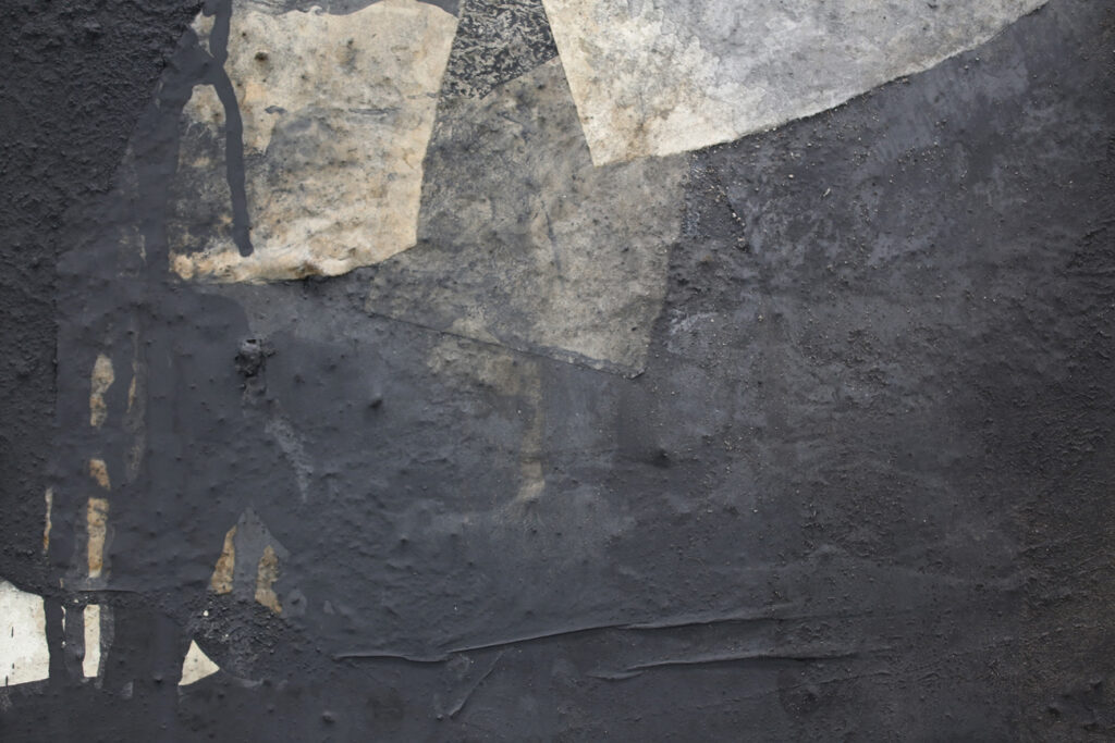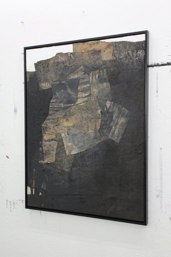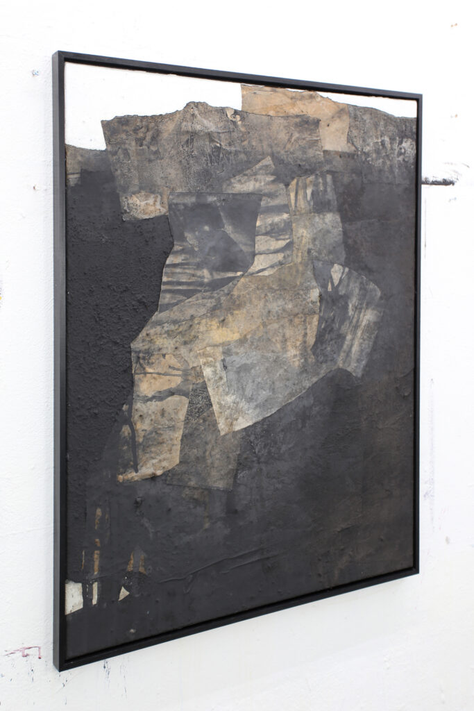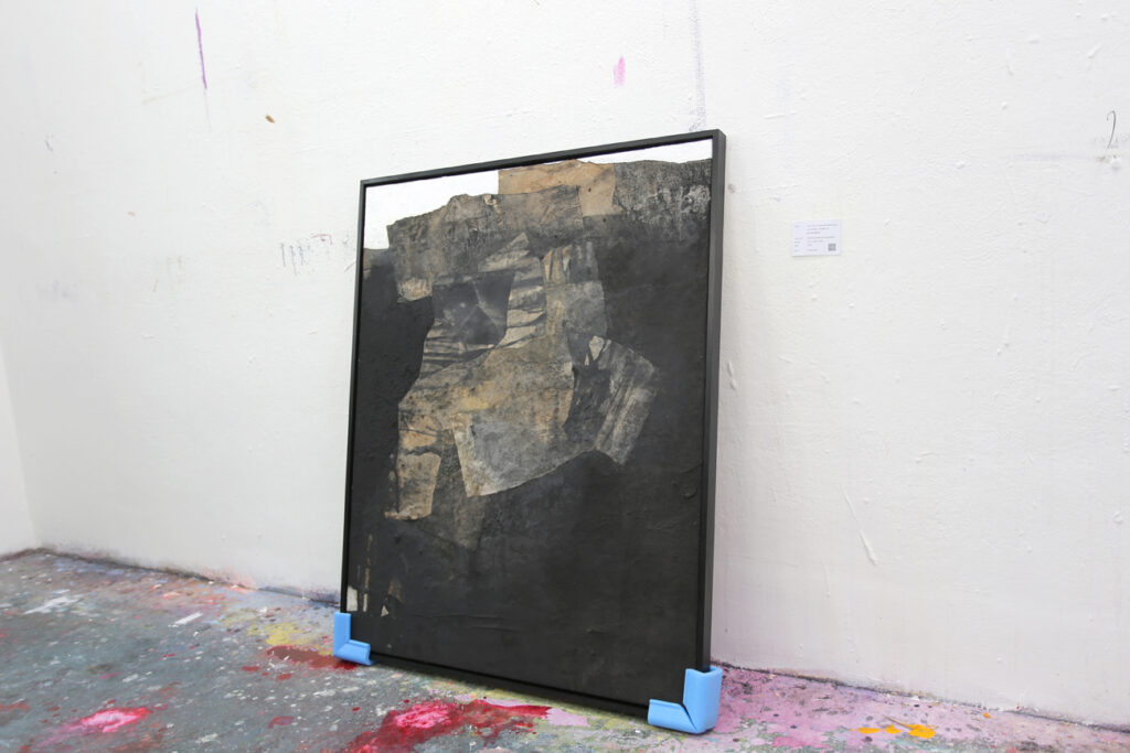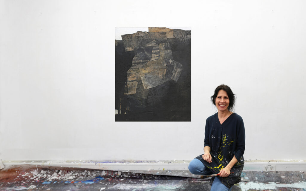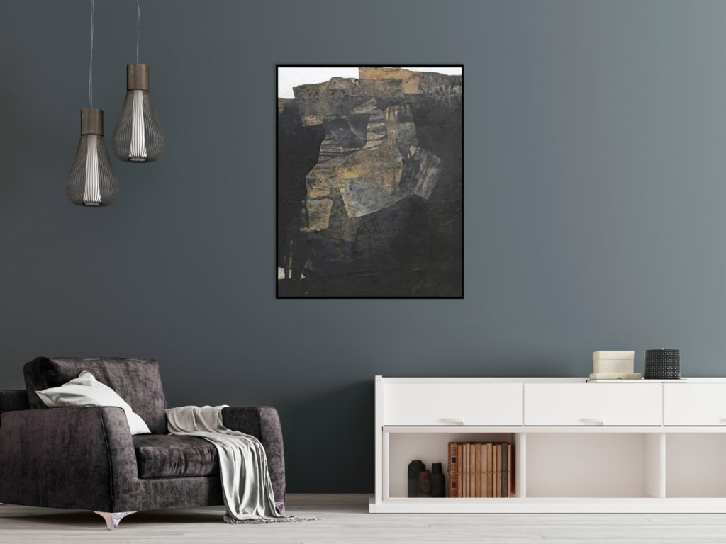 Diese abstrakte Arbeit ist eine informelle Malerei in Mischtechnik, die mit strukturgebenden und unterschiedlichen Materialen gefertigt, wie zum Beispiel Asche, Kaffee, Chinapapier und Pigmente, die in vielen Schichten aufeinanderliegen. Die mit Kaffee und Rußpigment getränkten Papiere sind in dem Bild eingearbeitet und teilweise mit Pigmentschichten wieder überlagert. Dadurch entsteht eine sehr haptische Oberfläche. Das Bild ist sehr dunkel, trotzdem vermittelt es einen warmen und sehr ruhigen Eindruck. Mir war es wichtig, zu zeigen, dass die Welt nicht nur schwarz und weiß ist, sondern dass es immer (egal in welchem Kontext) auf die Zwischentöne ankommt. Sei es ein komplexer Zustand, der zu analysieren ist, sei es ein Gespräch unter Liebenden. Völlig egal – nichts ist je schwarz weiß.