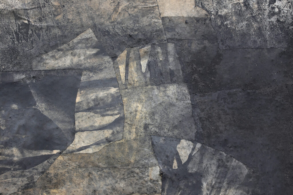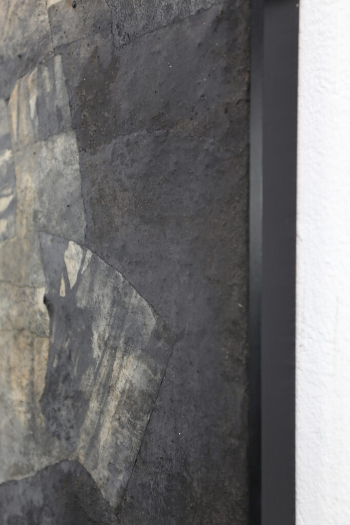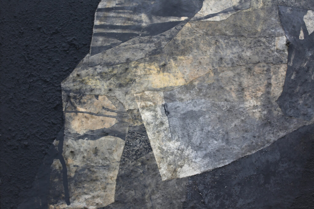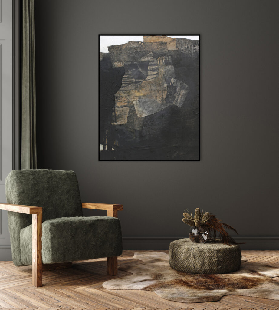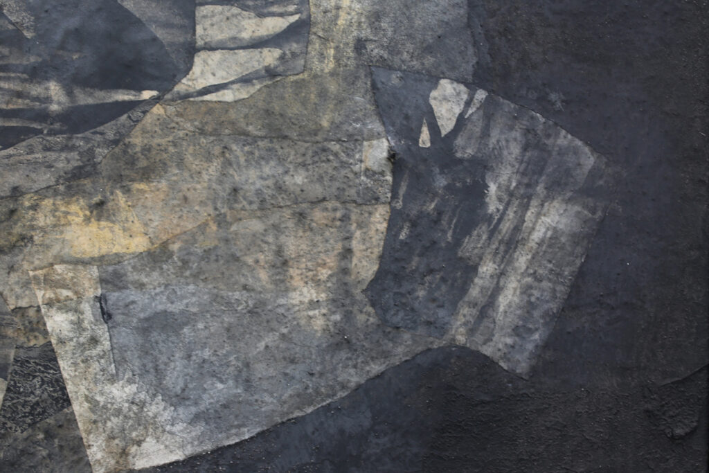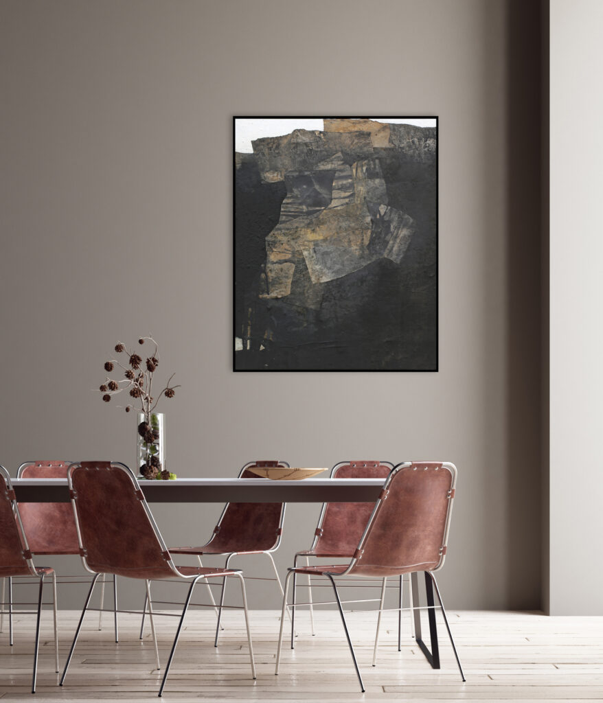 Diese abstrakte Arbeit ist eine informelle Malerei in Mischtechnik, die mit strukturgebenden und unterschiedlichen Materialen gefertigt, wie zum Beispiel Asche, Kaffee, Chinapapier und Pigmente, die in vielen Schichten aufeinanderliegen. Die mit Kaffee und Rußpigment getränkten Papiere sind in dem Bild eingearbeitet und teilweise mit Pigmentschichten wieder überlagert. Dadurch entsteht eine sehr haptische Oberfläche. Das Bild ist sehr dunkel, trotzdem vermittelt es einen warmen und sehr ruhigen Eindruck. Mir war es wichtig, zu zeigen, dass die Welt nicht nur schwarz und weiß ist, sondern dass es immer (egal in welchem Kontext) auf die Zwischentöne ankommt. Sei es ein komplexer Zustand, der zu analysieren ist, sei es ein Gespräch unter Liebenden. Völlig egal – nichts ist je schwarz weiß.