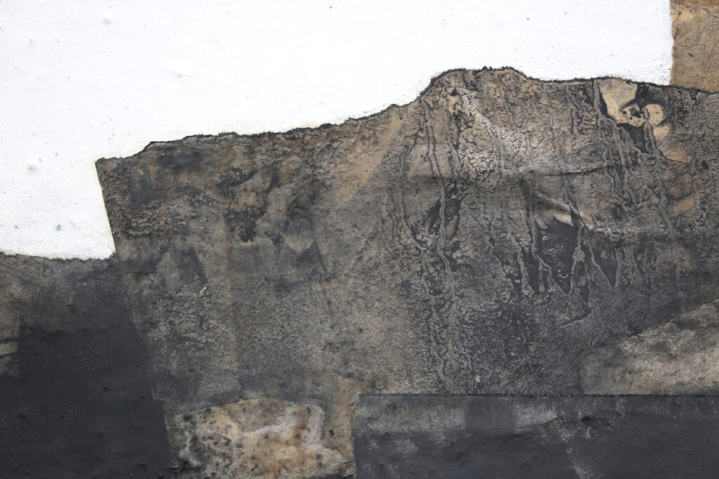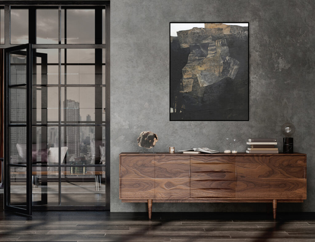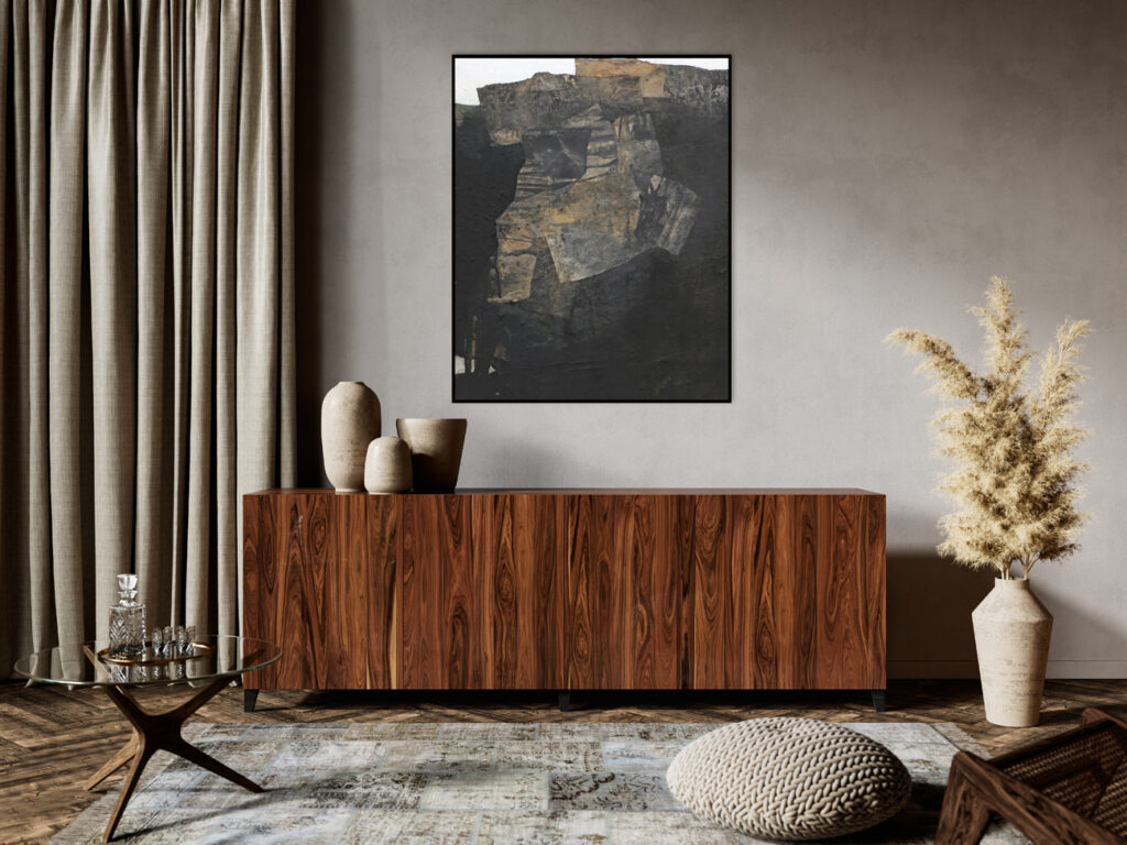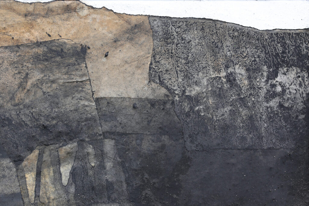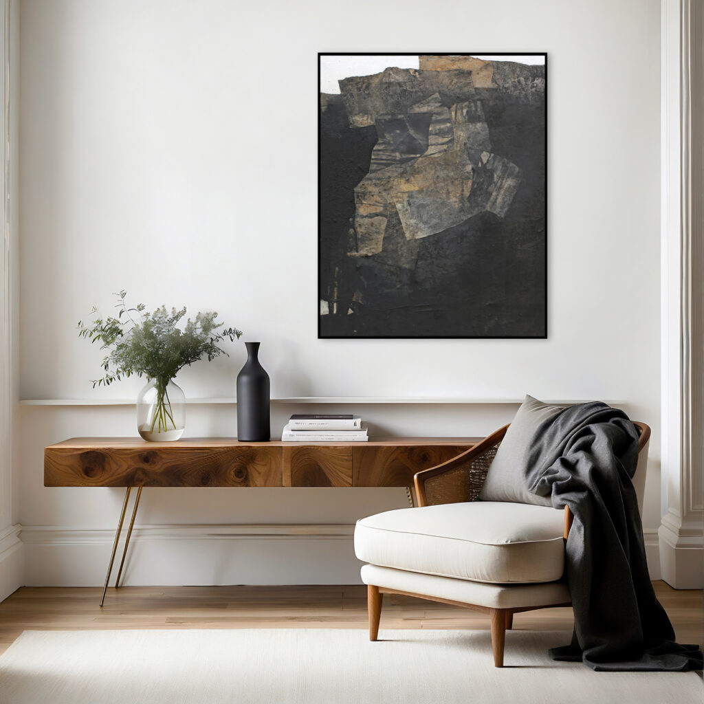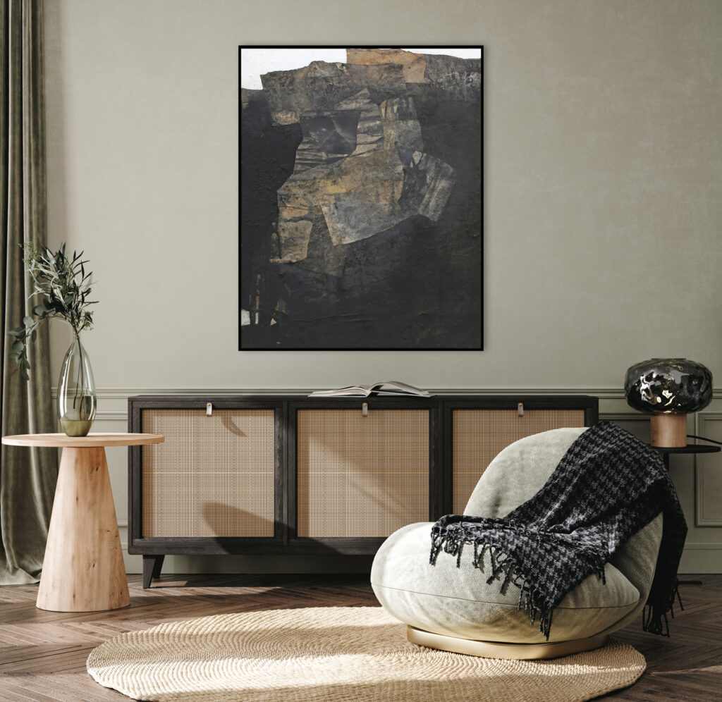 Diese abstrakte Arbeit ist eine informelle Malerei in Mischtechnik, die mit strukturgebenden und unterschiedlichen Materialen gefertigt, wie zum Beispiel Asche, Kaffee, Chinapapier und Pigmente, die in vielen Schichten aufeinanderliegen. Die mit Kaffee und Rußpigment getränkten Papiere sind in dem Bild eingearbeitet und teilweise mit Pigmentschichten wieder überlagert. Dadurch entsteht eine sehr haptische Oberfläche. Das Bild ist sehr dunkel, trotzdem vermittelt es einen warmen und sehr ruhigen Eindruck. Mir war es wichtig, zu zeigen, dass die Welt nicht nur schwarz und weiß ist, sondern dass es immer (egal in welchem Kontext) auf die Zwischentöne ankommt. Sei es ein komplexer Zustand, der zu analysieren ist, sei es ein Gespräch unter Liebenden. Völlig egal – nichts ist je schwarz weiß.