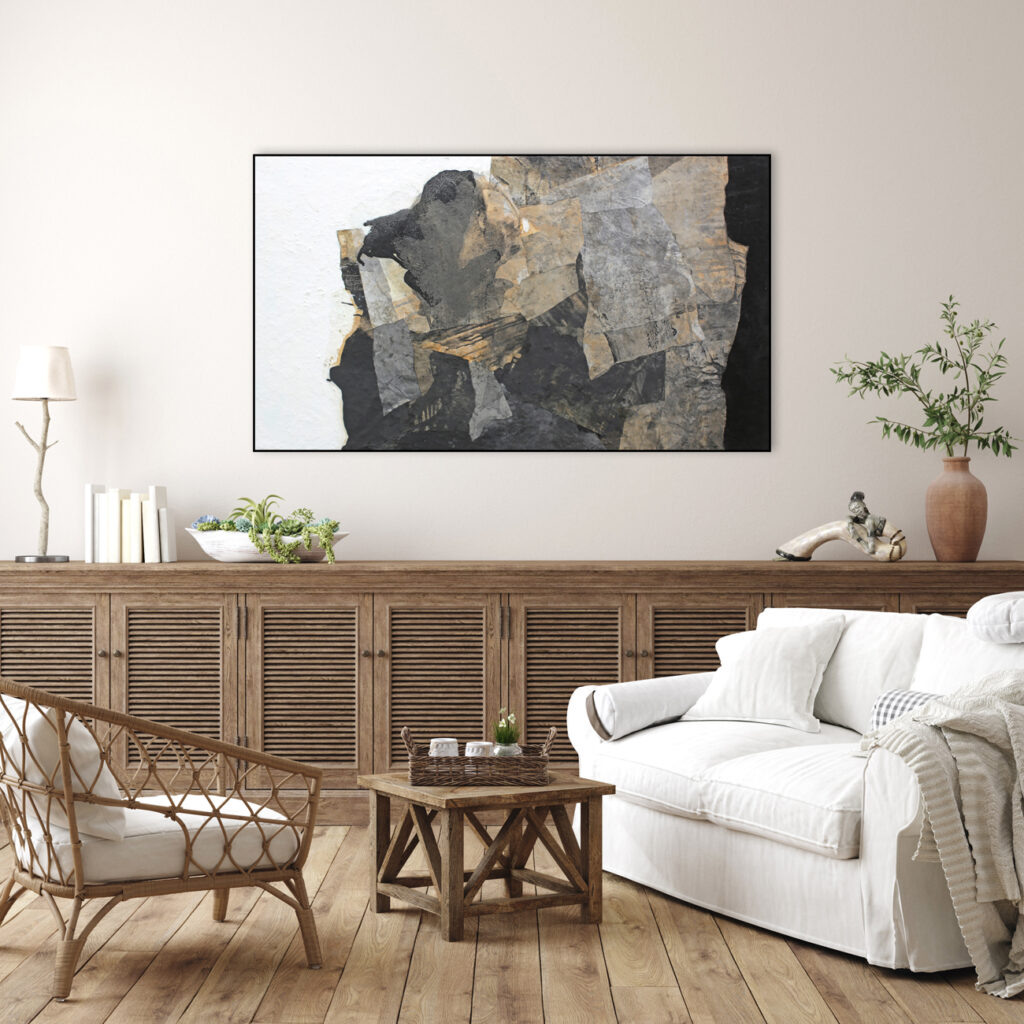 Gerahmt ist das Gemälde mit einem schwarzen Schattenfugenrahmen aus Holz.